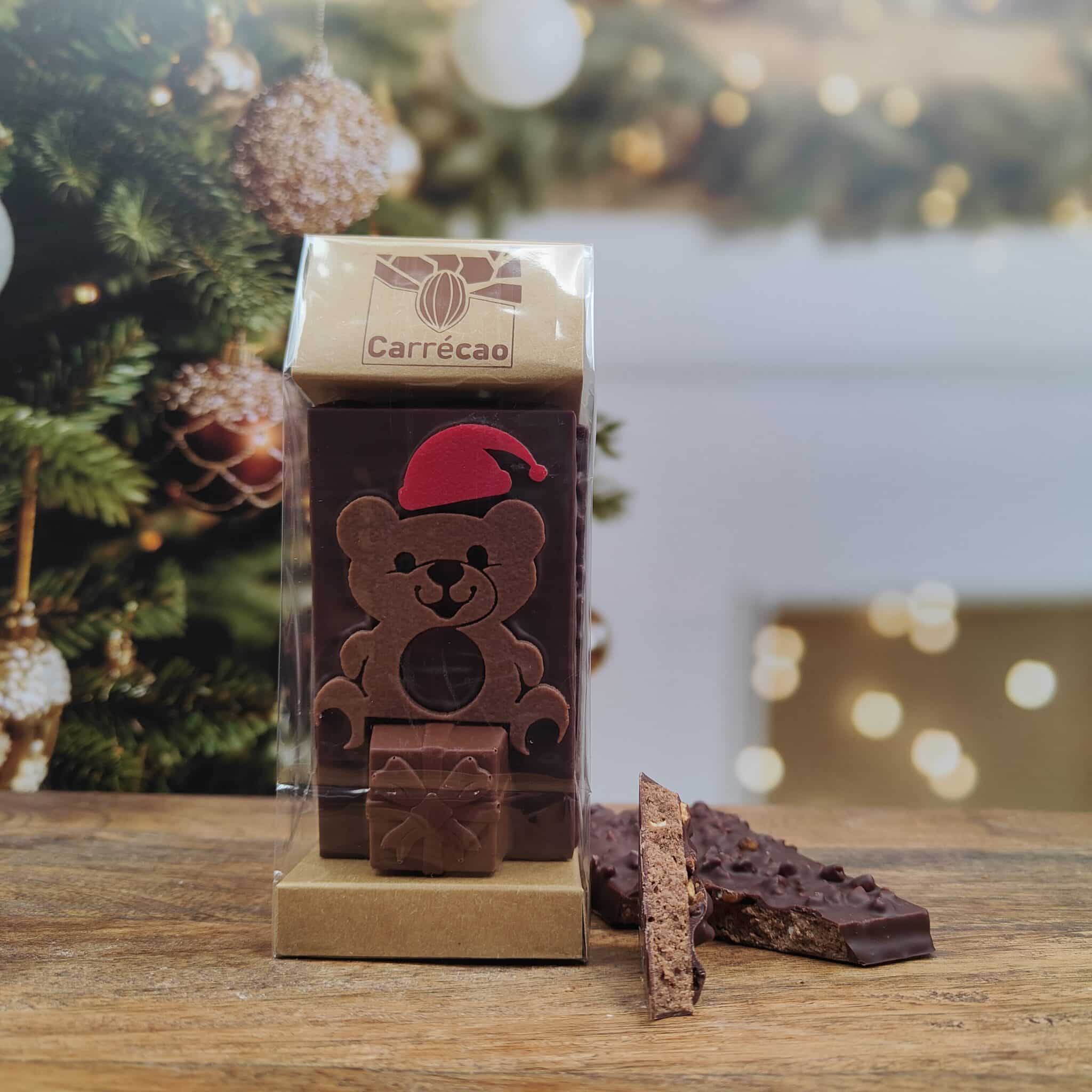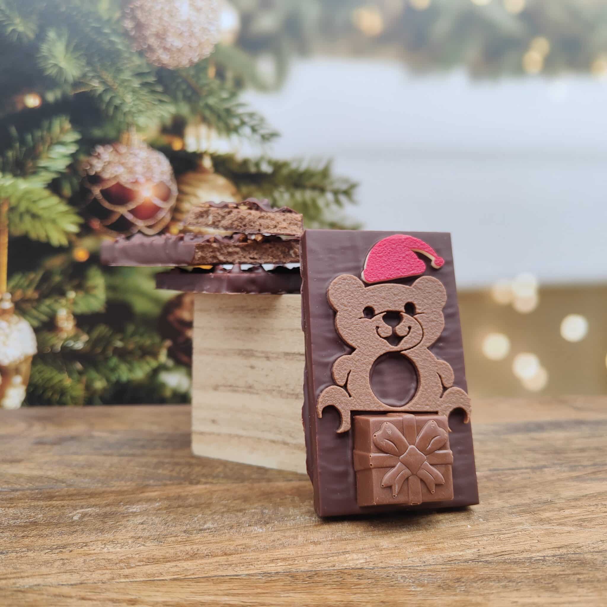 - La bouchée “Ourson” est décorée d’une plaquette en chocolat bau lait, d’un délicate bonnet en chocolat blanc colorée et d’un paquet cadeau craquant en chocolat lait. Notre colorant rouge est 100% naturel issu de poudres de fruits et de légumes. Derrière cet ourson, se cache une seconde bouchée qui vient compléter le sachet, celle-ci est recouverte de noisettes caramélisées avant l’enrobage, ce qui lui confère un puissant pouvoir de séduction auprès des plus gourmands !
