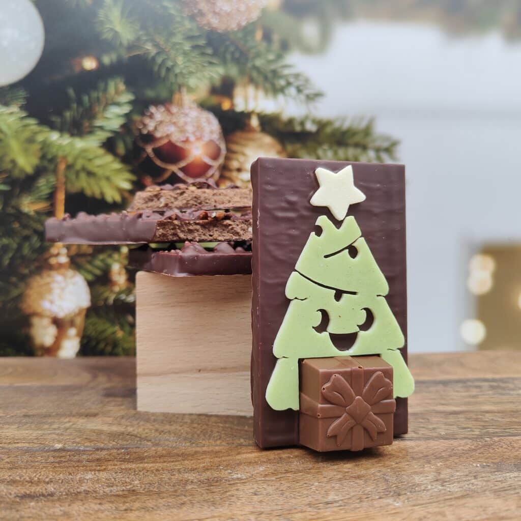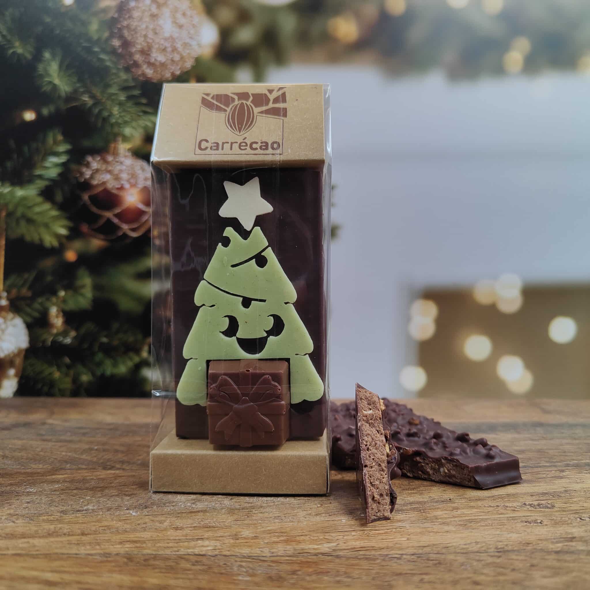 - La bouchée “Sapin” est décorée d’une plaquette en chocolat blanc coloré, d’une délicate étoile en chocolat blanc et d’un paquet cadeau craquant en chocolat lait. Notre colorant vert est 100% naturel issu de poudres de fruits et de légumes. Derrière ce sapin, se cache une seconde bouchée qui vient compléter le sachet, celle-ci est recouverte de noisettes caramélisées avant l’enrobage, ce qui lui confère un puissant pouvoir de séduction auprès des plus gourmands !