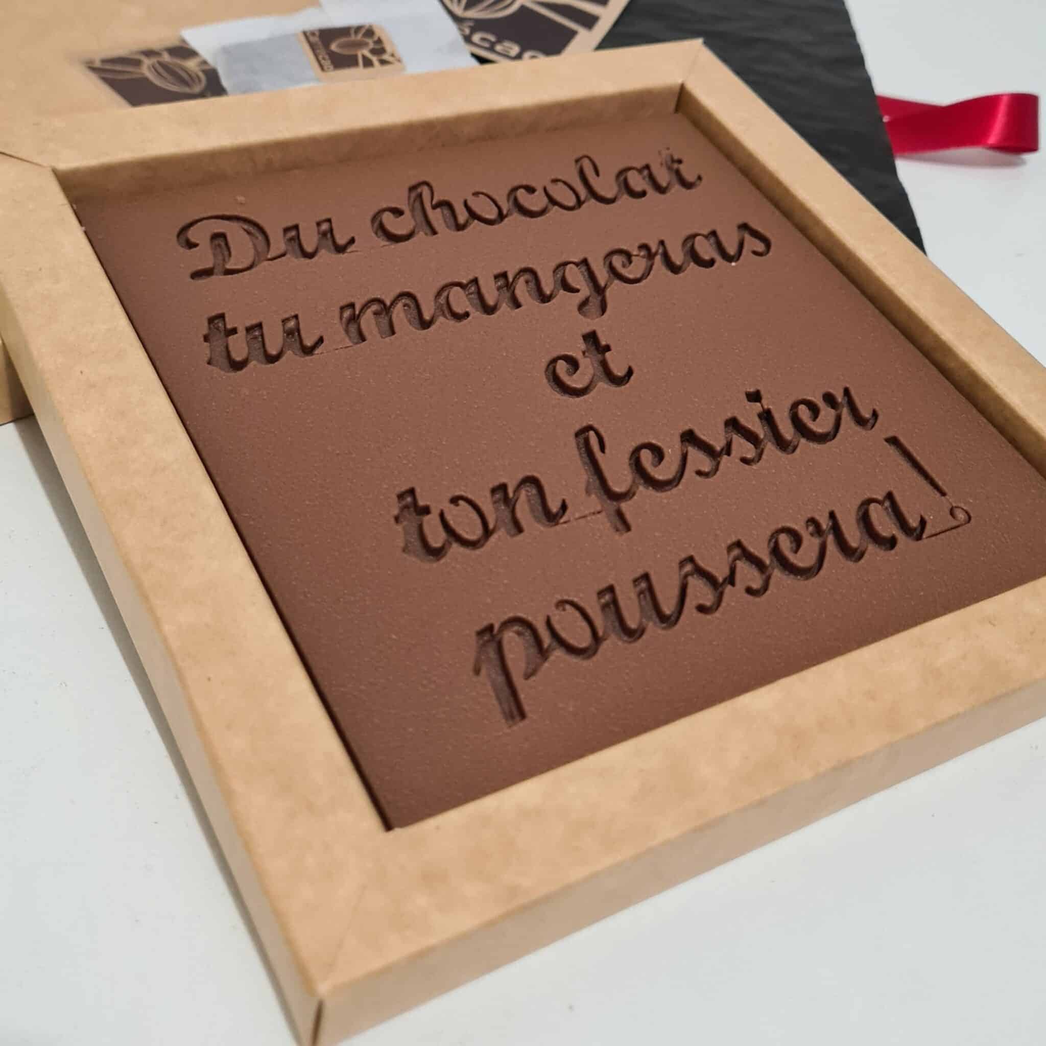 Quatre ou cinq lignes de texte, entièrement libre, pour vous permettre d’exprimer tous vos messages. Un cadeau d’anniversaire, une invitation, une annonce à faire, le chocolat reste une valeur sûre et saura faire plaisir et émouvoir vos proches.
