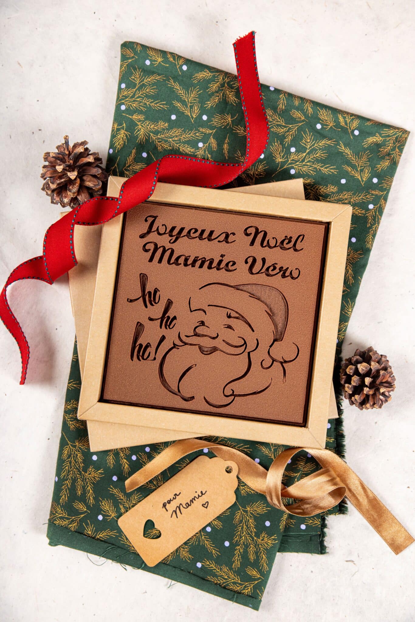 Offrir du chocolat personnalisé, c’est bien plus que simplement offrir un morceau de chocolat. Imaginez le sourire se dessiner sur le visage de votre ami(e), de votre parent, lorsqu’il/elle découvre ce joli Père Noël au pied du spin, agrémenté d’un texte écrit avec amour pour lui ou elle.