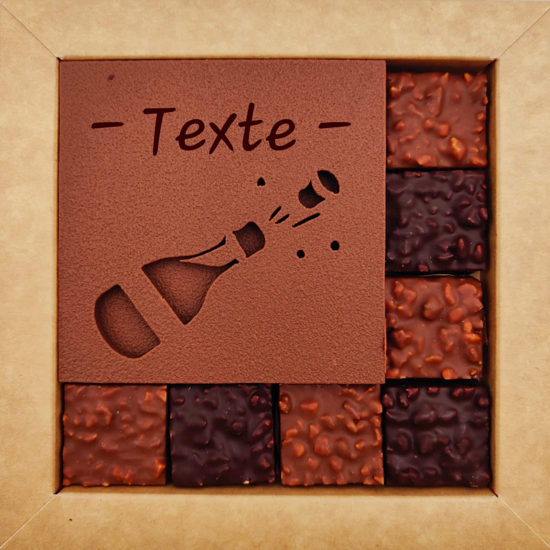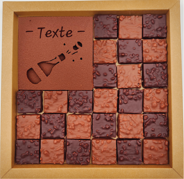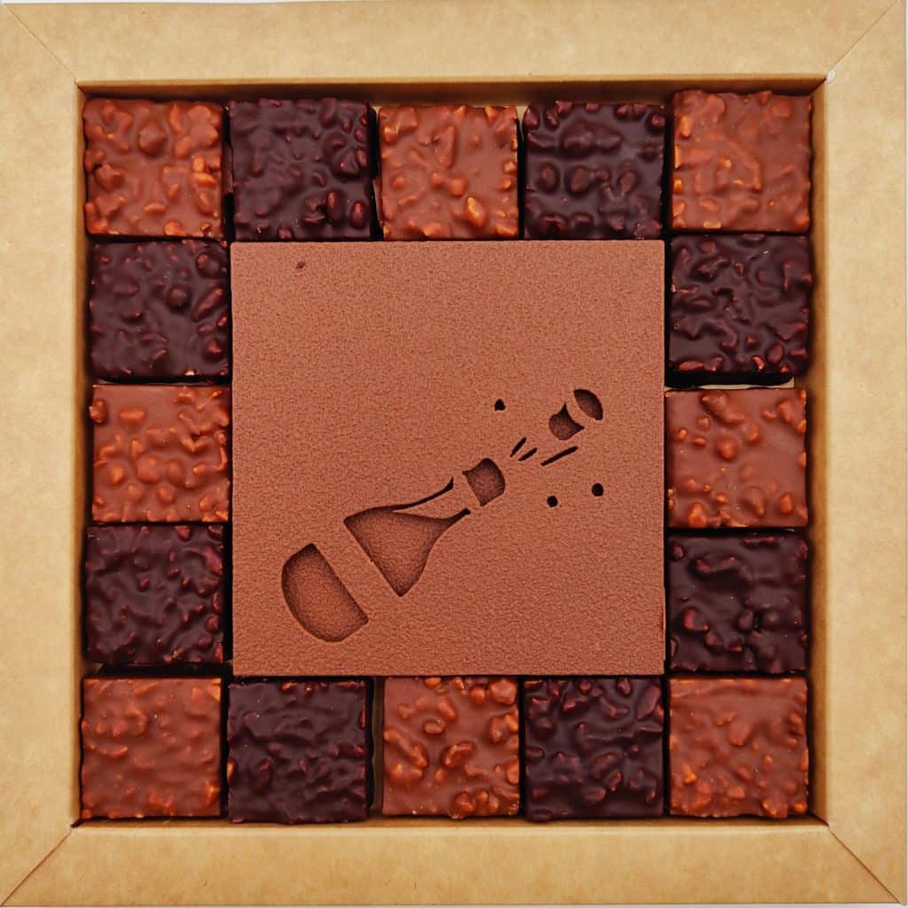 Nos coffrets de chocolat personnalisés sont composés d’une tablette de 8cm en chocolat noir ou chocolat au lait personnalisable avec le prénom ou le surnom de votre choix. Autour de cette tablette, vous trouverez 7 ou 16 bonbons, qui sont garnis de notre incontournable praliné maison croustillant et enrobés de chocolat noir 70% et chocolat au lait 45%.