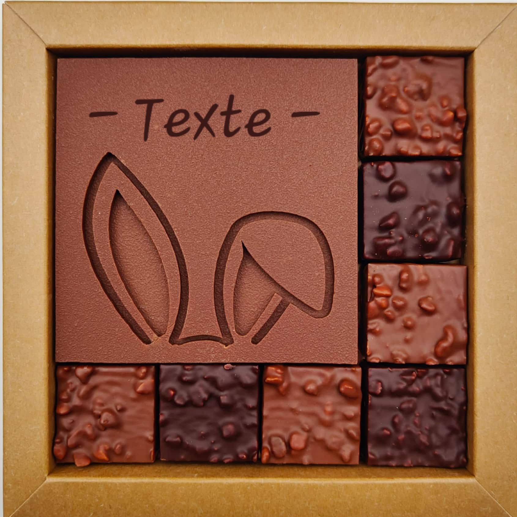 Plongez dans la créativité avec notre coffret chocolat de Pâques. Chaque tablette peut être personnalisée avec le message de votre choix, offrant ainsi une expérience chocolatée personnalisée qui ravira vos proches.