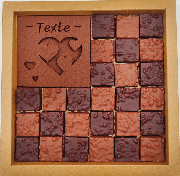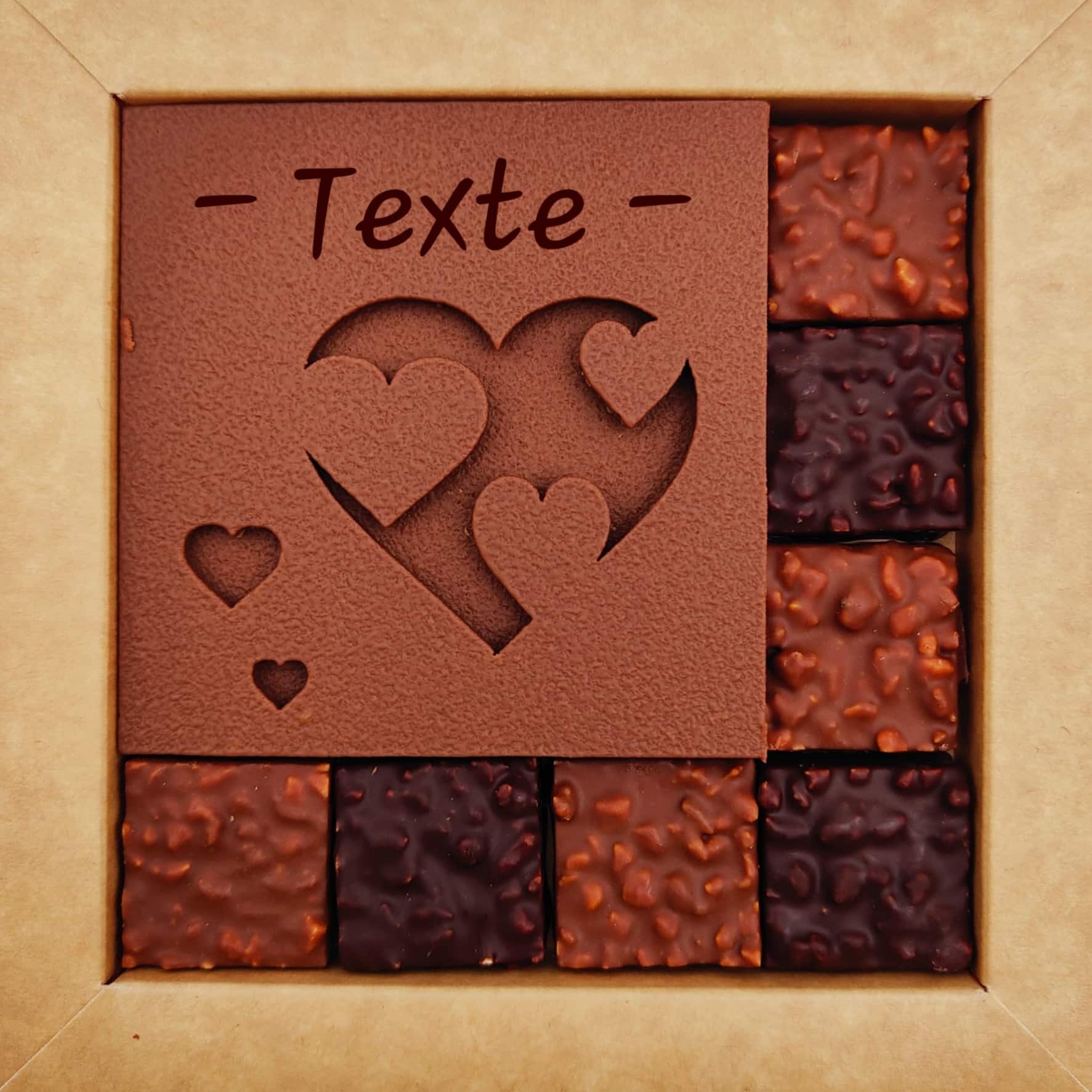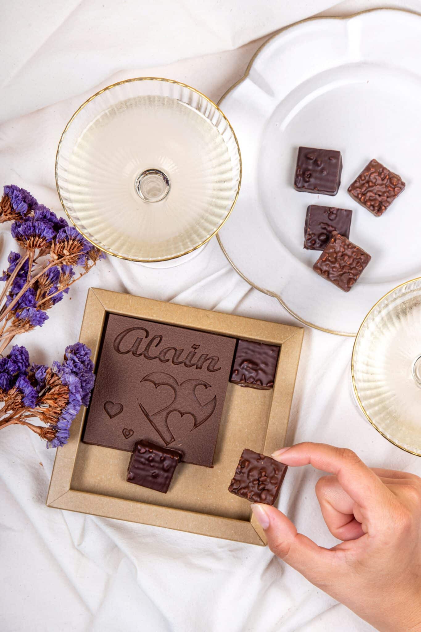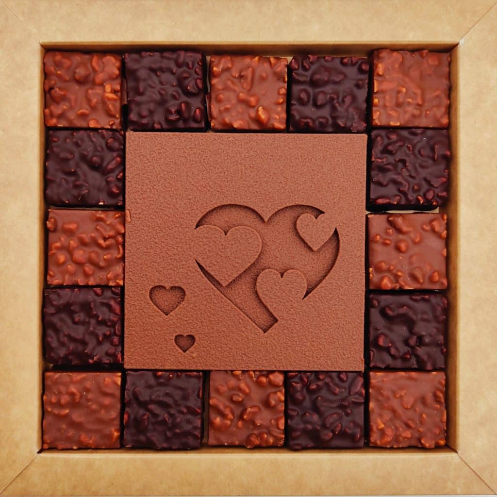 Nos coffrets de chocolat personnalisés sont composés d’une tablette de 8cm en chocolat noir ou chocolat au lait personnalisable avec le prénom ou le surnom de votre choix. Autour de cette tablette, vous trouverez 7, 16 ou 27 bonbons, qui sont garnis de notre incontournable praliné maison croustillant et enrobés de chocolat noir 71% et chocolat au lait 45%.
