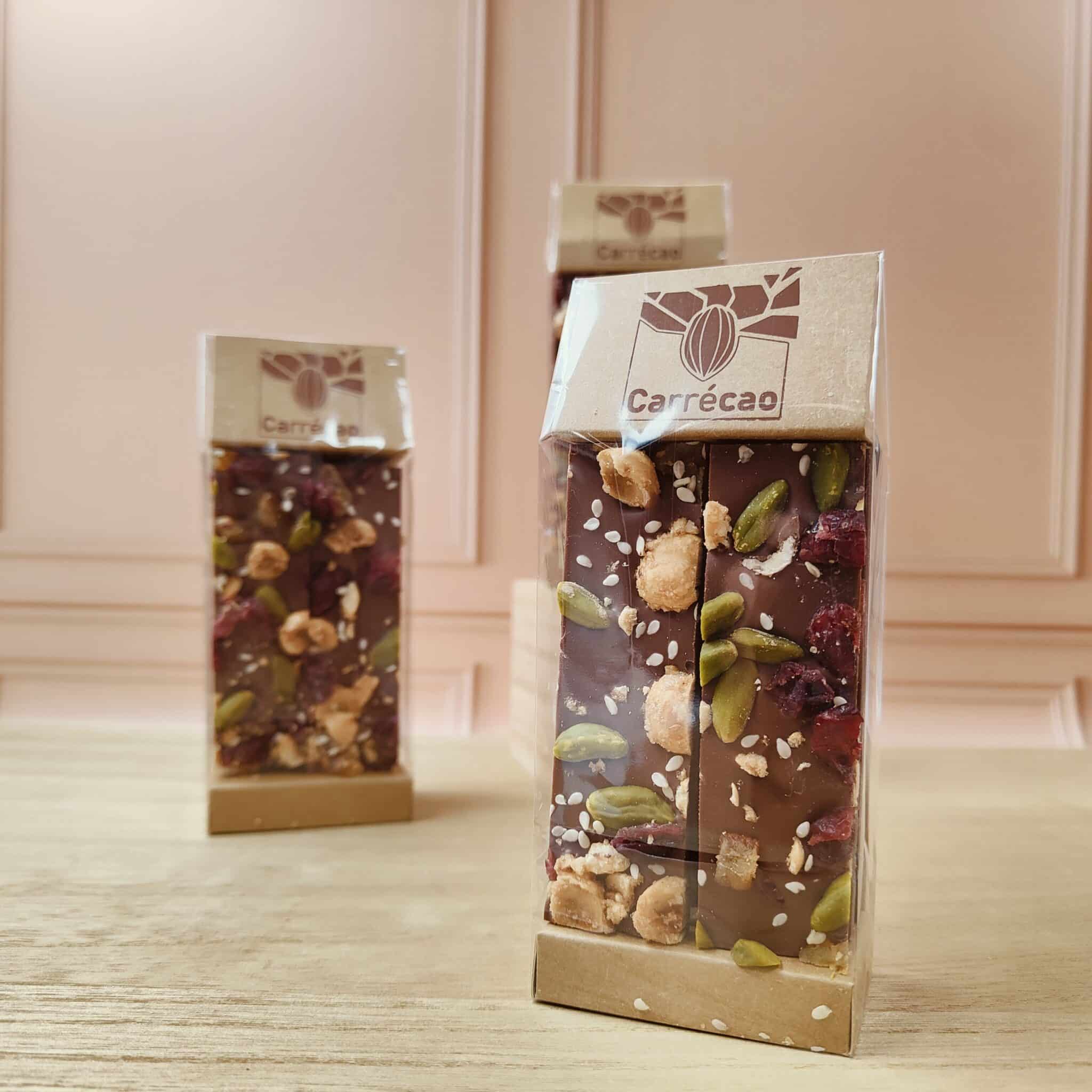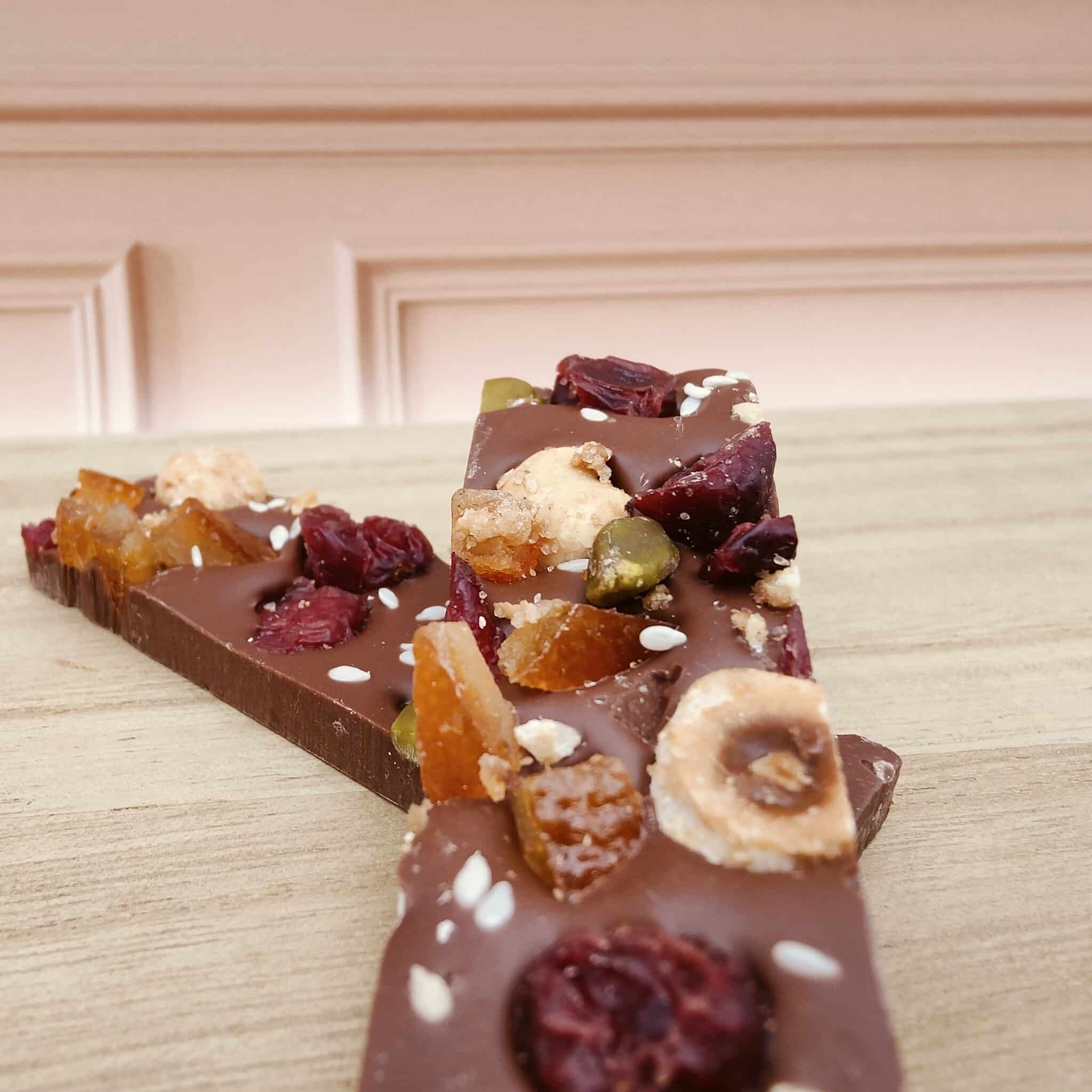 Nos chocolats mendiants vous accompagneront au quotidien. 6 portions de notre chocolat au lait 45% garnie de noisettes et pistaches torréfiées, cranberries, écorces d’oranges et une pointe de sésame blanc ! Une dégustation gourmande et un format généreux.